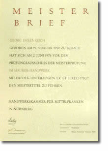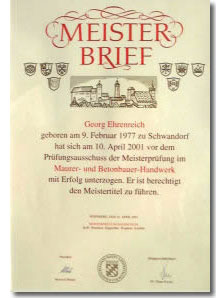 Am 10. April 2001 legte Georg Ehrenreich jun. seine Prüfung zum Maurermeister ab und übernahm die Leitung der Rohbauabteilung.
